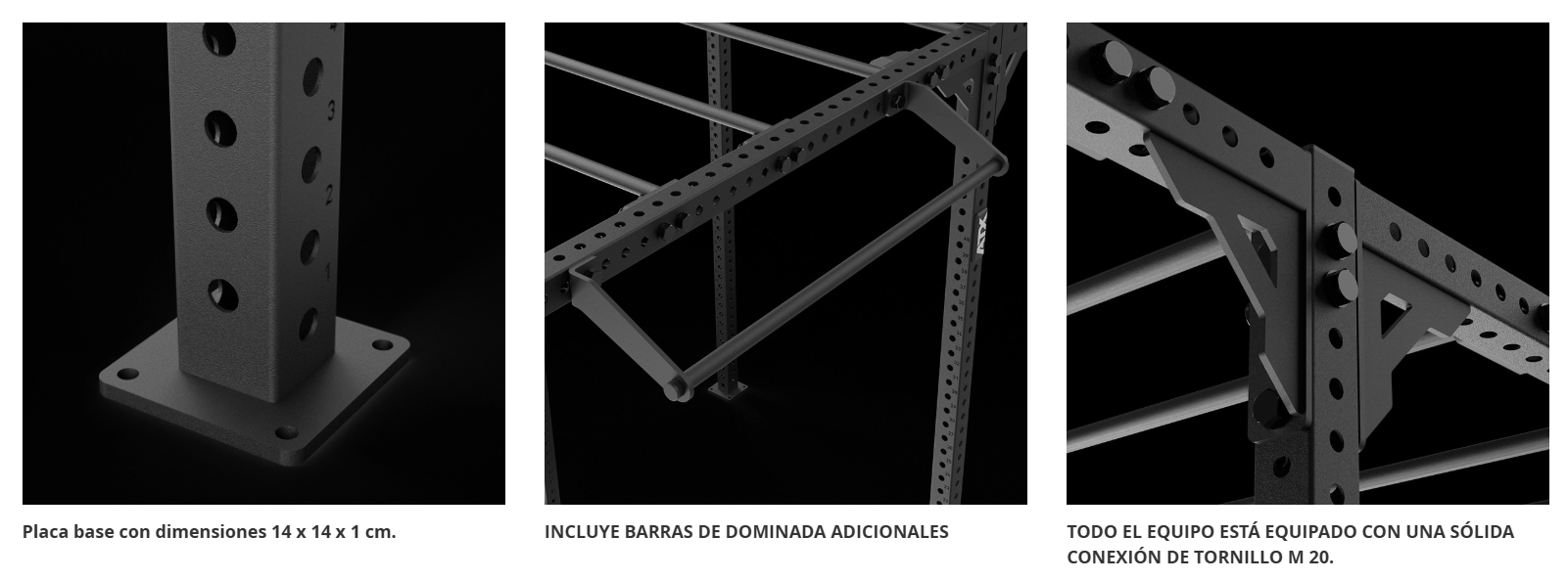 El RIG se puede ampliar de forma flexible con accesorios opcionales (se venden por separado), por ejemplo: ganchos en J, barras de inmersión, estaciones de fijación para sentadillas o soportes para mancuernas.