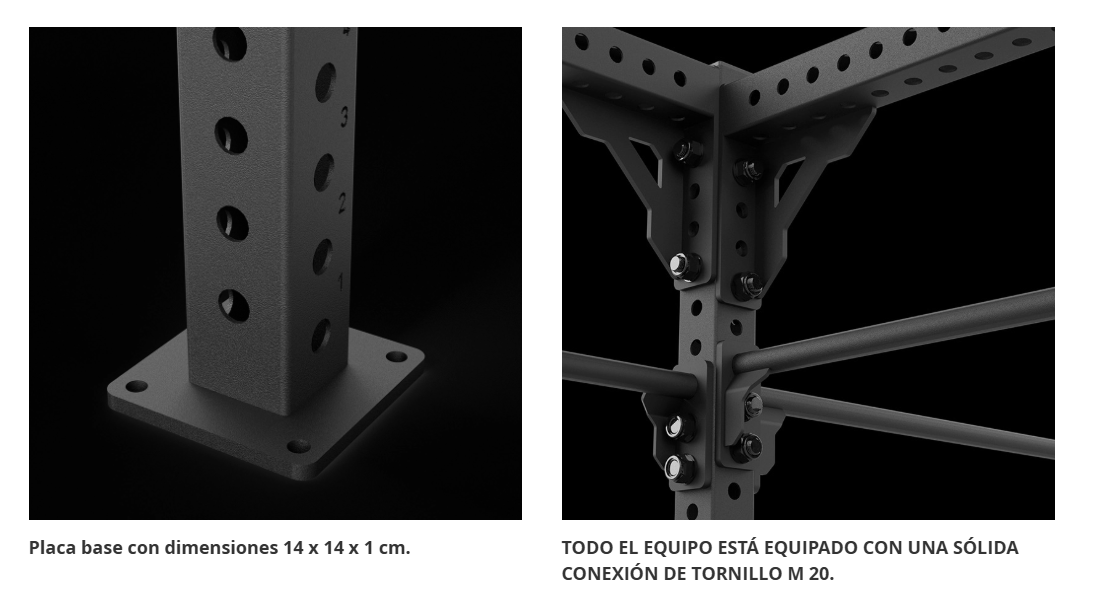 El RIG se puede ampliar de forma flexible con accesorios opcionales (se venden por separado), por ejemplo: ganchos en J, barras de inmersión, estaciones de fijación para sentadillas o soportes para mancuernas.