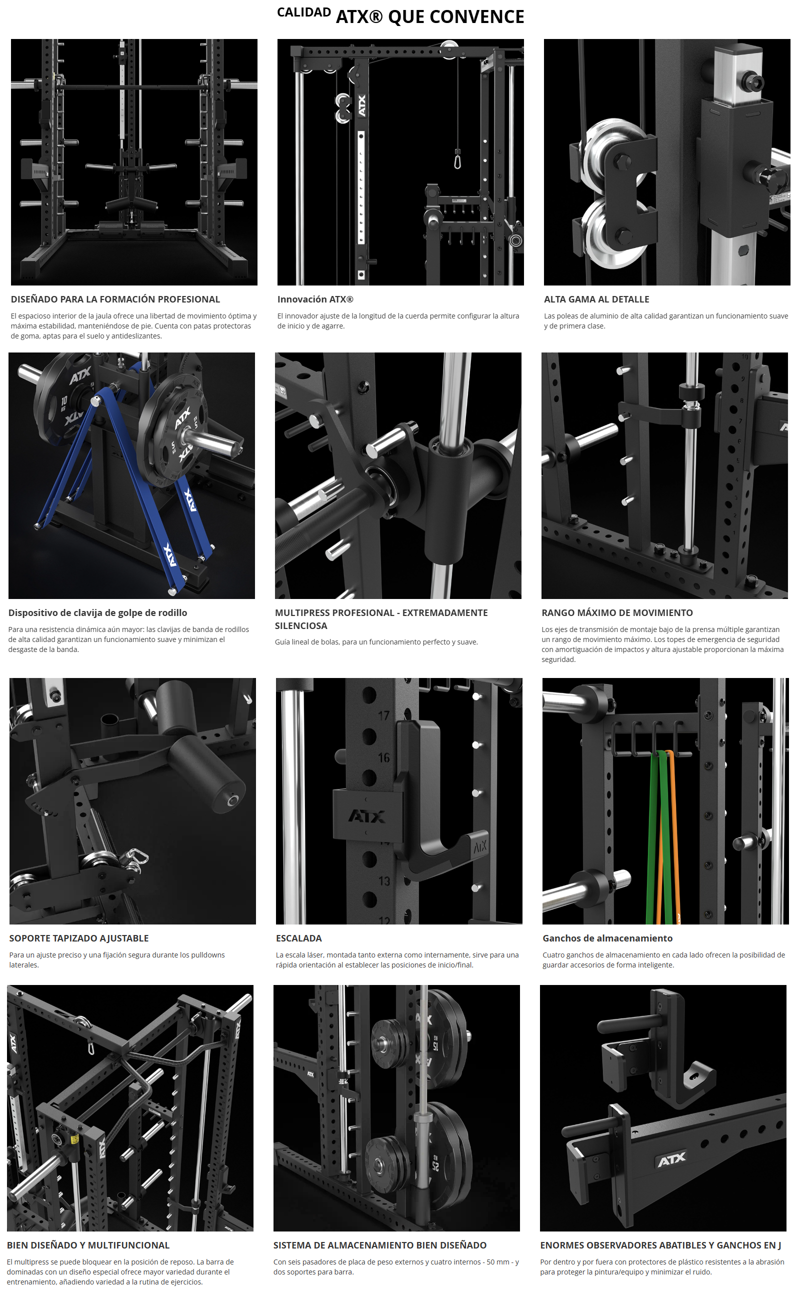 La sólida construcción de acero resistente a la torsión, hecha de tubos de acero de 70 x 70 x 3 mm de grosor, es absolutamente estable y está diseñada para soportar las cargas más altas, ideal para el entrenamiento diario intensivo. Los estantes y las posiciones de inicio y fin son ajustables individualmente y su manejo es fácil e intuitivo. Además, su manejo impresiona por su sofisticada ergonomía y su calidad profesional.
